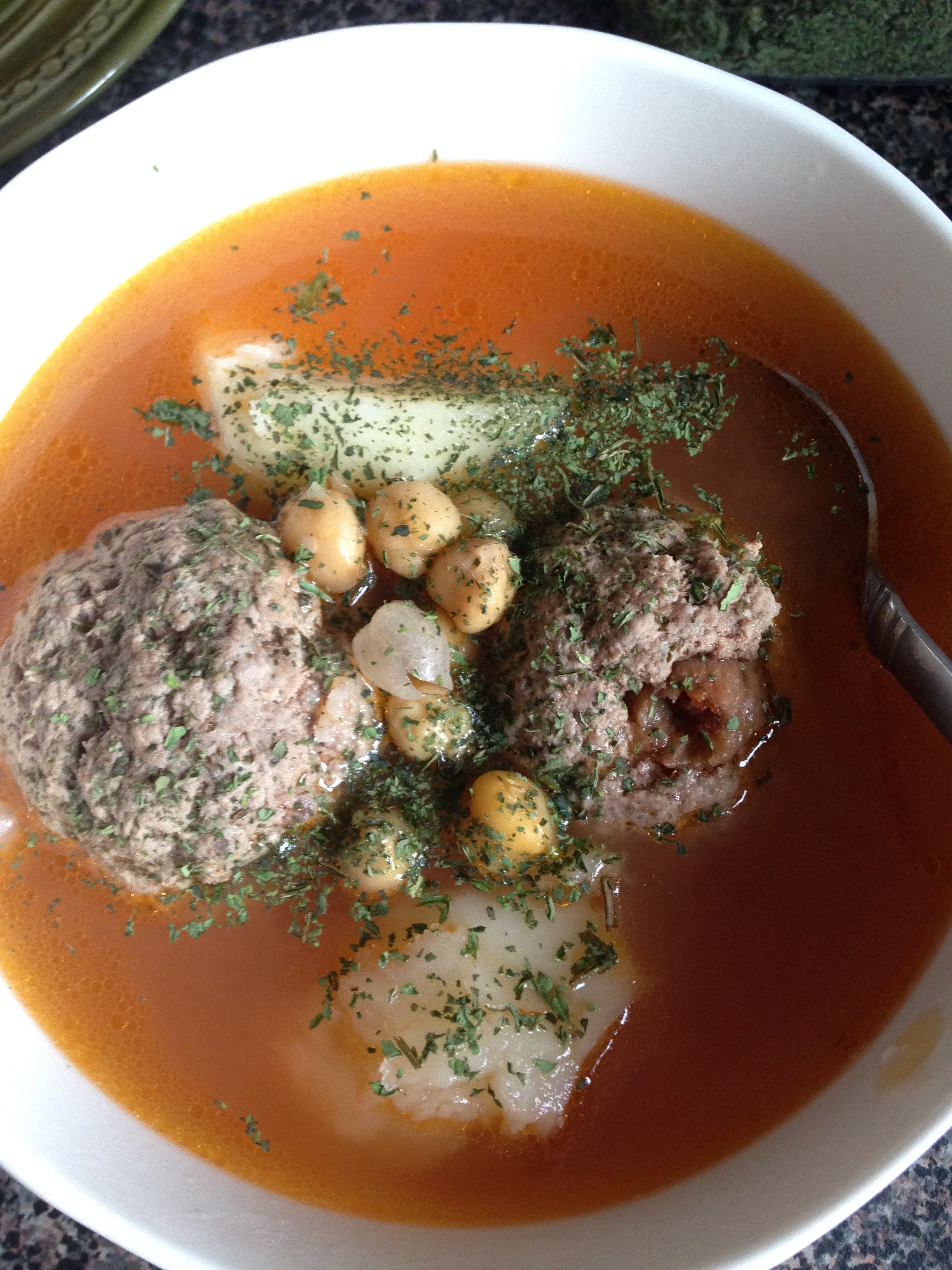 This dish is not a favorite by any means, but it is hearty and was perfect on a cold weather. It’s relatively easy to make, if you are not making the broth from scratch, or in my case, just using water.  My meat came out a little bit dry, but it was ok, because the way to eat this soup, is to crush the meatballs, and pieced of bread and eat it like one mushy mixture (doesn’t sound appetizing, but it is ).
