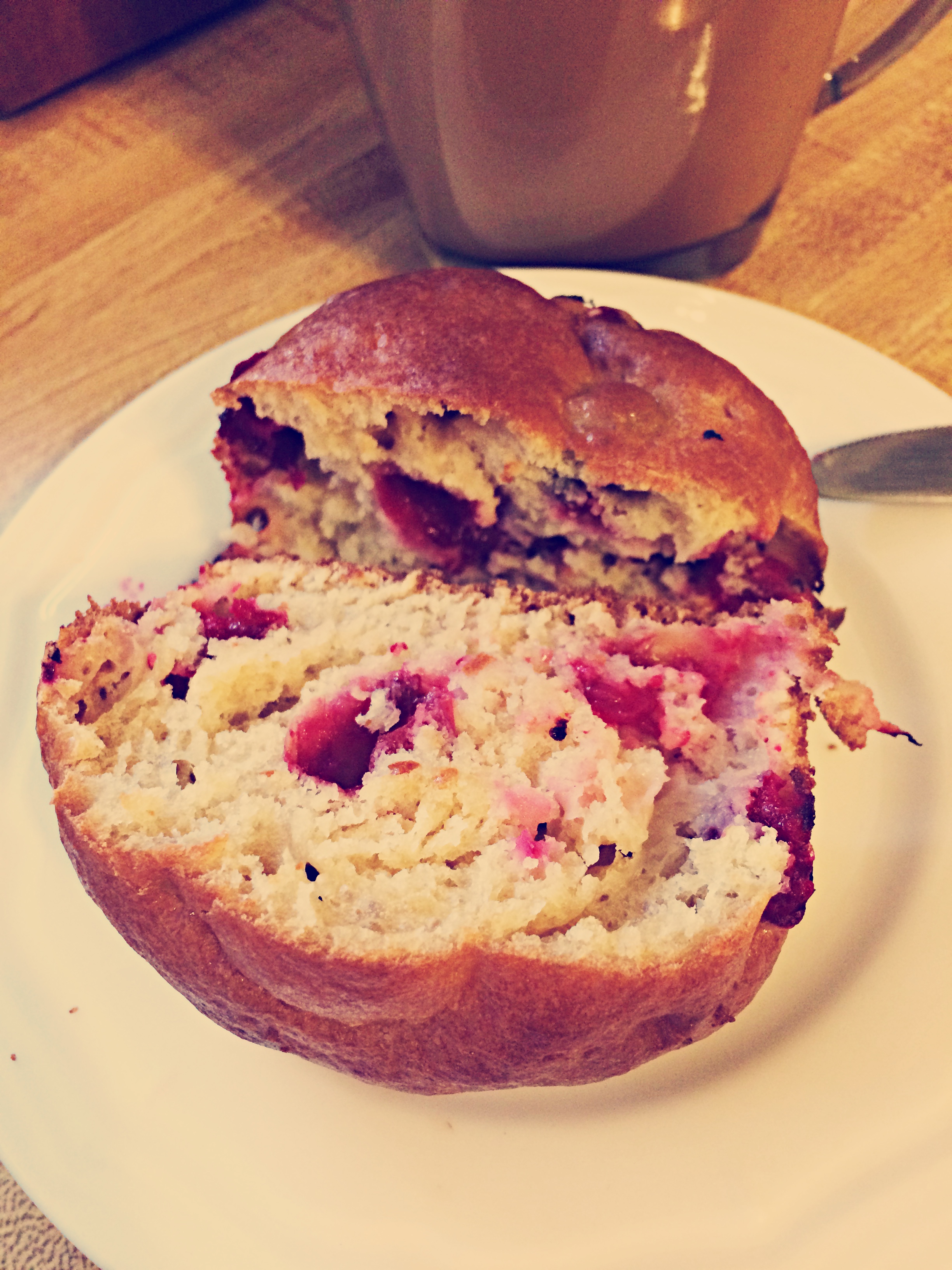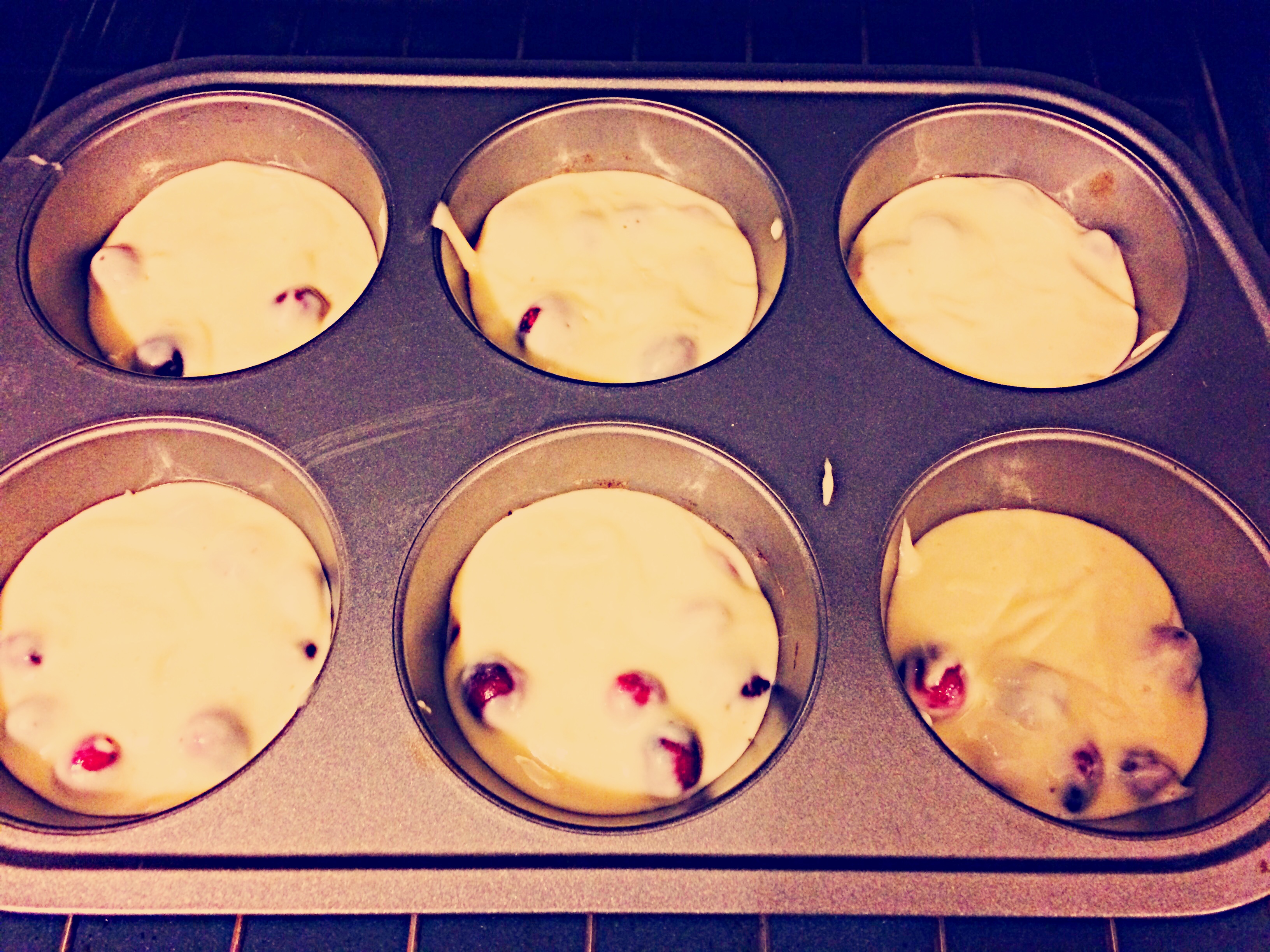 Note: the cranberries I used were tart. They made the muffins very tart. Which is ok by me, gives me an excuse to spread jam or Nutella on them. But if you’d like them sweet, I would suggest tossing the cranberries in with 1 tbs of sugar and setting aside for 30 mins or so. If you choose this route, I would reduce the sugar that will go into the batter.