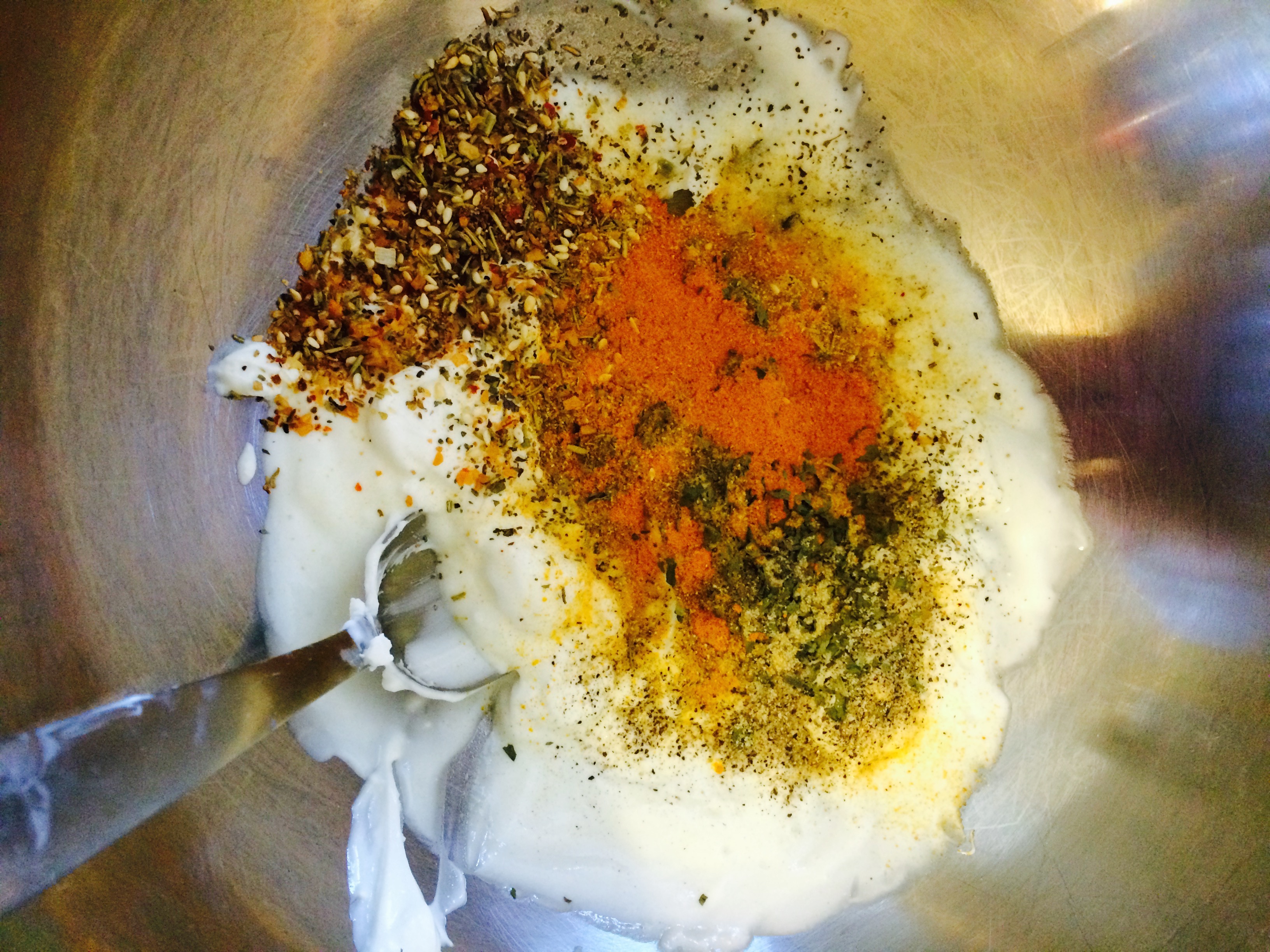 Preheat the oven to 375, In a large pan combine everything except chicken. Stir well. Dip every piece of chicken in the yogurt mixture. Use your hands to make sure the yogurt mixture gets all over the pieces. Don’t be afraid to use too much, you want the chicken to be moist.